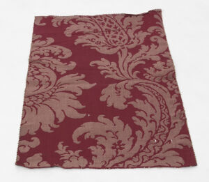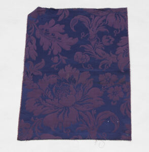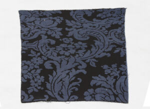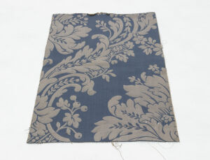 Woven pale blue and cream fabric sample decorated with flowers and foliage