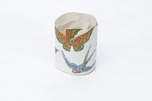 Textured cream wallpaper with bluebirds and butterflies, found in donor's home
