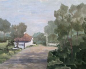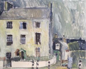 Oil painting depicting a house on a corner