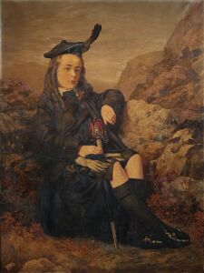 Oil painting depicting a portrait of a child in Highland dress