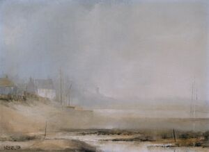 Oil painting depicting a coastal scene