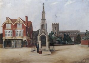 Oil painting entitled 'Enfield Market Place with church'