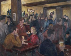 Framed oil painting depicting the interior of the busy 'Stag and Hounds' pub on Bury Street in Edmonton after the Second World War