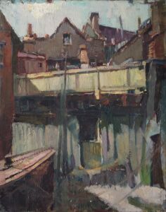 Oil painting depicting an urban scene