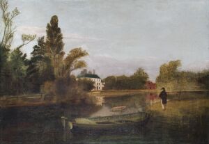 Oil painting depicting a man fishing at Forty Hall