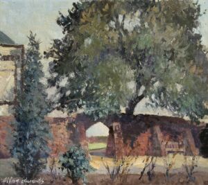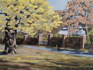 Framed oil painting entitled 'The Leaning Wall, Broomfield Park', by Denis Coote