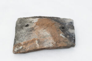 Handmade red clay ceramic roof tile. Discoloured from Broomfield House fire 25.04.1984