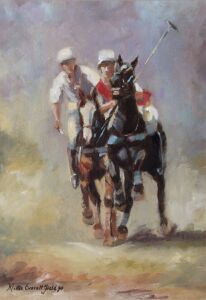 Framed oil painting entitled 'Polo Ponies with Riders', by Mollie Everett Field