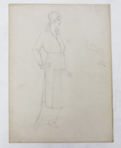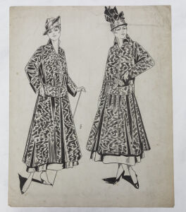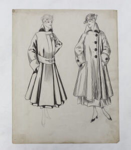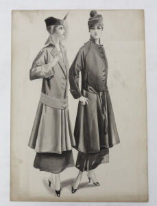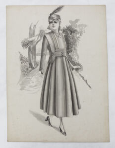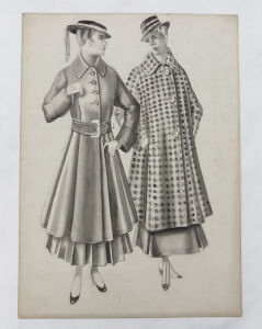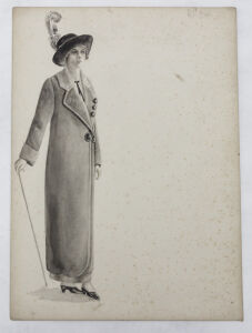 Fashion illustration showing a woman in a coat and hat standing in a garden