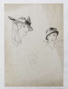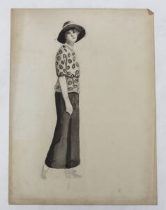 Fashion illustration showing a woman in a skirt, blouse, jacket and hat