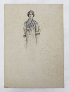 Fashion illustration showing a woman in a long day dress with lace details around the collar and cuffs
