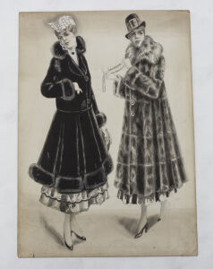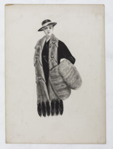 Fashion illustration showing a woman wearing a black coat with a fur muff and stole