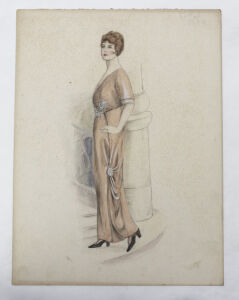 Fashion illustration showing a woman in a long peach coloured occasion dress
