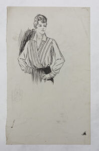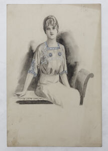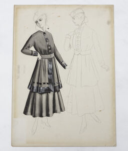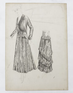 Fashion illustration showing a woman in a long dark dress with a lace collar