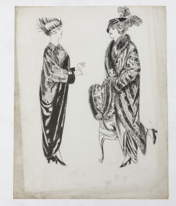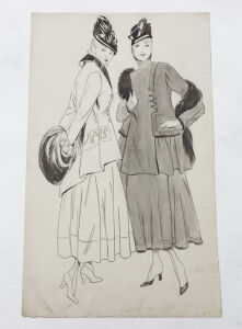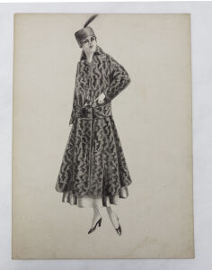 Fashion illustration showing a woman sitting in an outdoor coat, hat, muff and stole