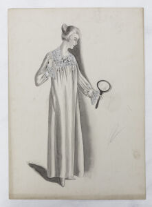 Fashion illustration showing a woman in a lace nightgown holding a mirror